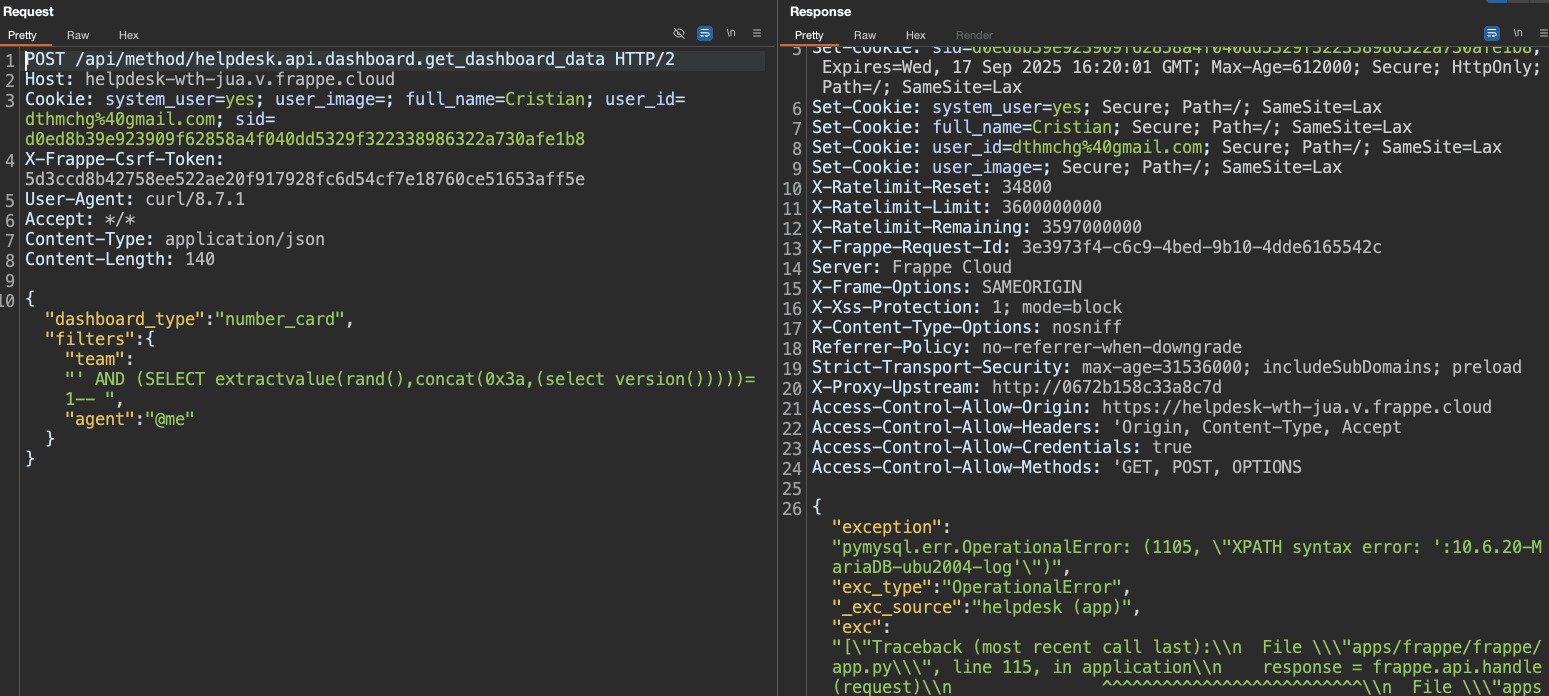 Frappe Helpdesk 1.14.0 — SQL Injection in dashboard “get_dashboard_data” endpoint (filters.team)