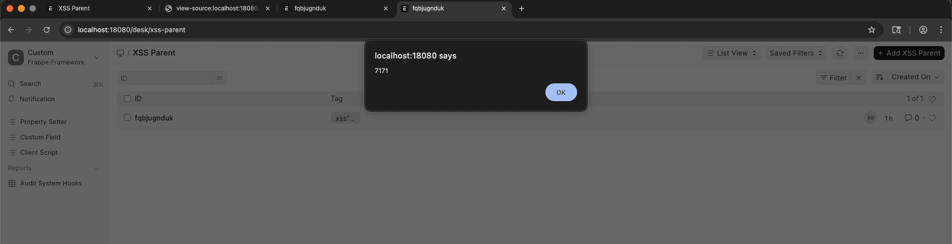 Frappe Framework 16.10.0 - Stored DOM XSS in Tag Pill Renderer